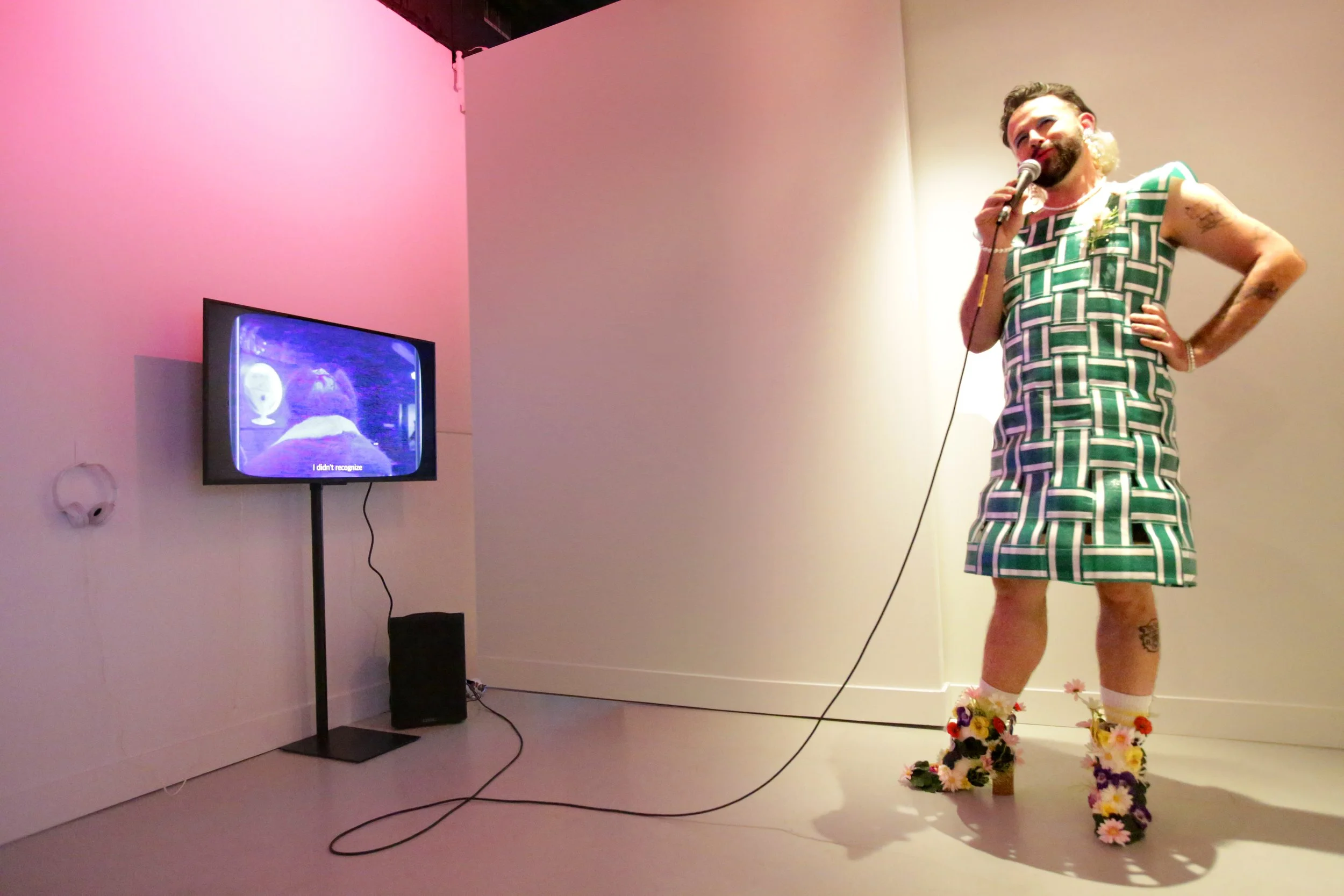 I returned to this work in Helen and Alice Have a Grandchild (2024), a five-minute performance built around a handwoven dress made from the same lawn chair materials (70 × 20 × 20 inches) and paired with size 12 go-go boots adorned with artificial flowers. Wearing the dress, I performed as an imagined grandchild of Helen and Alice, telling the story of their life together with humor and care.